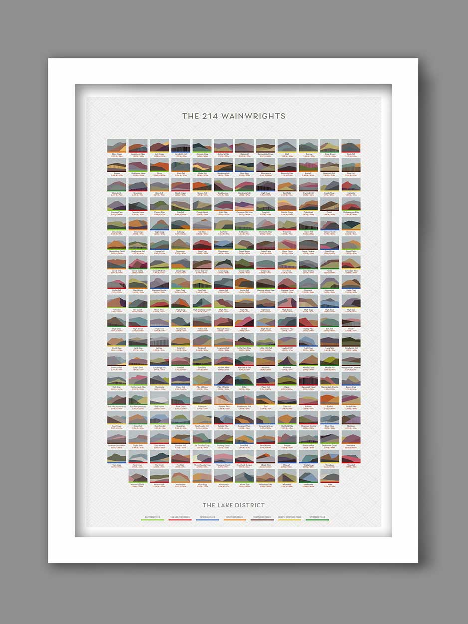 All 214 Wainwrights in The Lake District are detailed on this poster print. Our 214 Wainwrights poster features all the Lake District fellsĀ alphabetically in a geometric styled profile,Ā along with the heights. Colour code barsĀ are based on the original Alfred Wainwright walking books representing the 7 volumes and area categorisation.Ā PresentedĀ Ā A perfect gift for fell walkers and those taking on the challenge to complete all the Wainwrights. Height measures in both feet and meters.