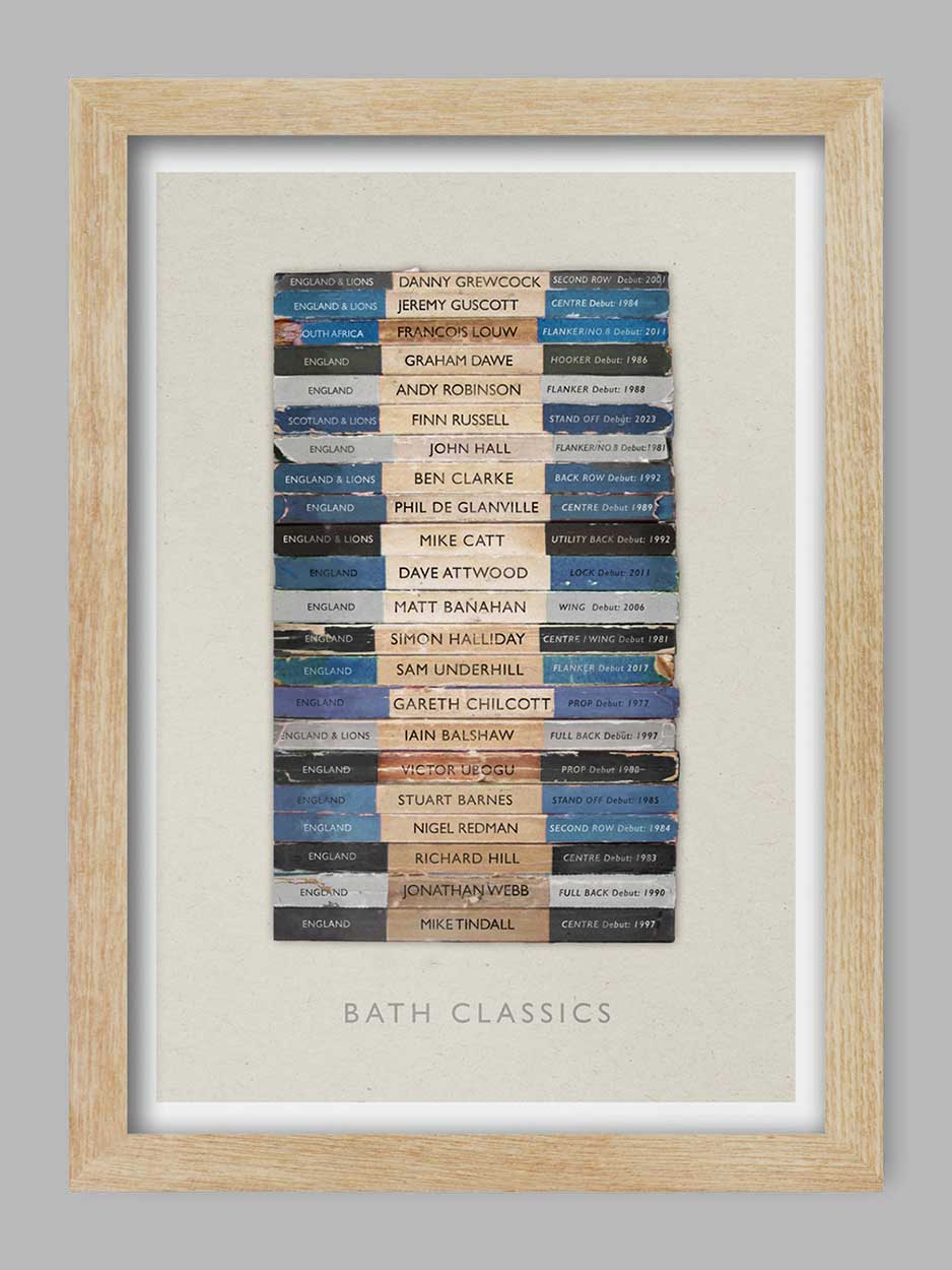 Bath Classics - Rugby poster print celebrates some of the great names in the club's history. It features their debut years and their international representation. Styled on the classic mid-century penguin book designs.Ā