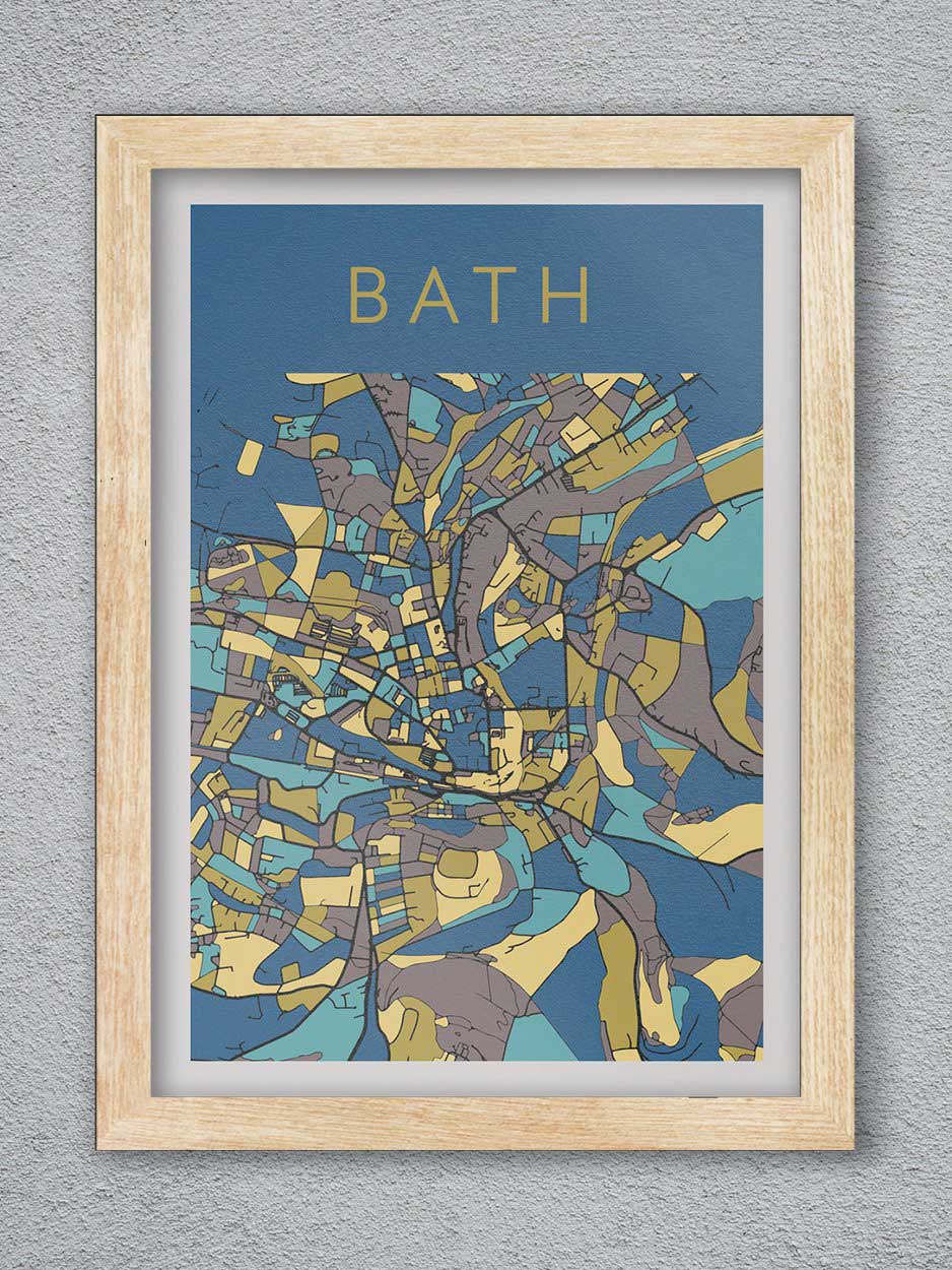 Our Bath City Poster Print is part map and part stained glass effect. The abstract poster design of the the City of Bath, depicts one of England's most beautiful and historic cities.