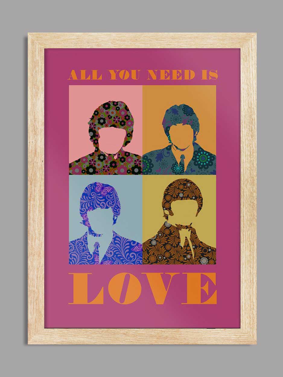 Beatles All You Need Is Love Music Poster Print is printed on a smooth 230g stock and available unframed or framed in a wooden frame with clarity+ acrylic.