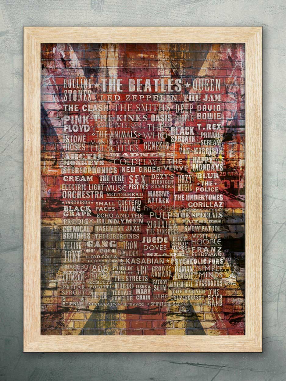 Brit Pop Music Poster Print is printed on a smooth 230g stock and available unframed or framed in a wooden frame with clarity+ acrylic.Ā