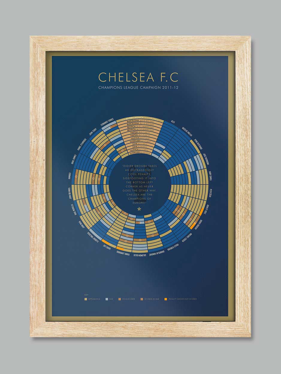 Our Chelsea Football Poster Print celebrates the Champions League Campaign that culminated in The Blues reaching the pinnacle of European Football. Having experienced the heartache of losing a Champions League Final penalty shoot-out in 2008, Chelsea enjoyed the euphoria of winning from the penalty spot after a gutsy comeback against Bayern Munich.
