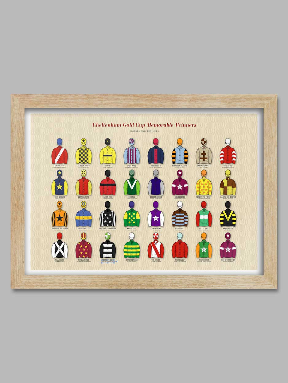 Cheltenham Gold Cup Memorable Winners - Poster Print is printed on a smooth 230g stock and available unframed or framed in a wooden frame with clarity+ acrylic.
