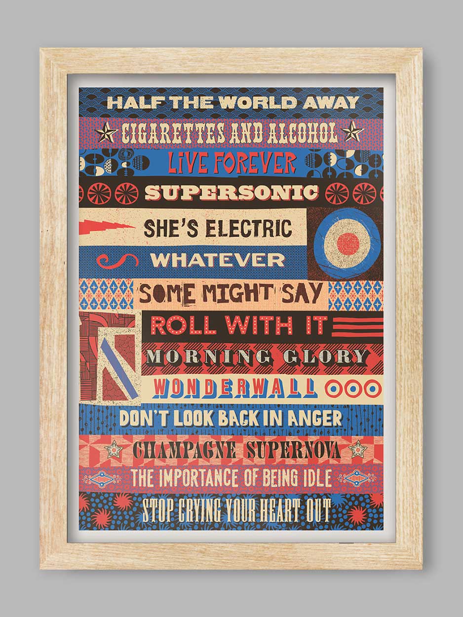 Definitely Glory - Oasis Typographic Music Poster Print features a selection of oasis singles in a hand drawn typographic style.