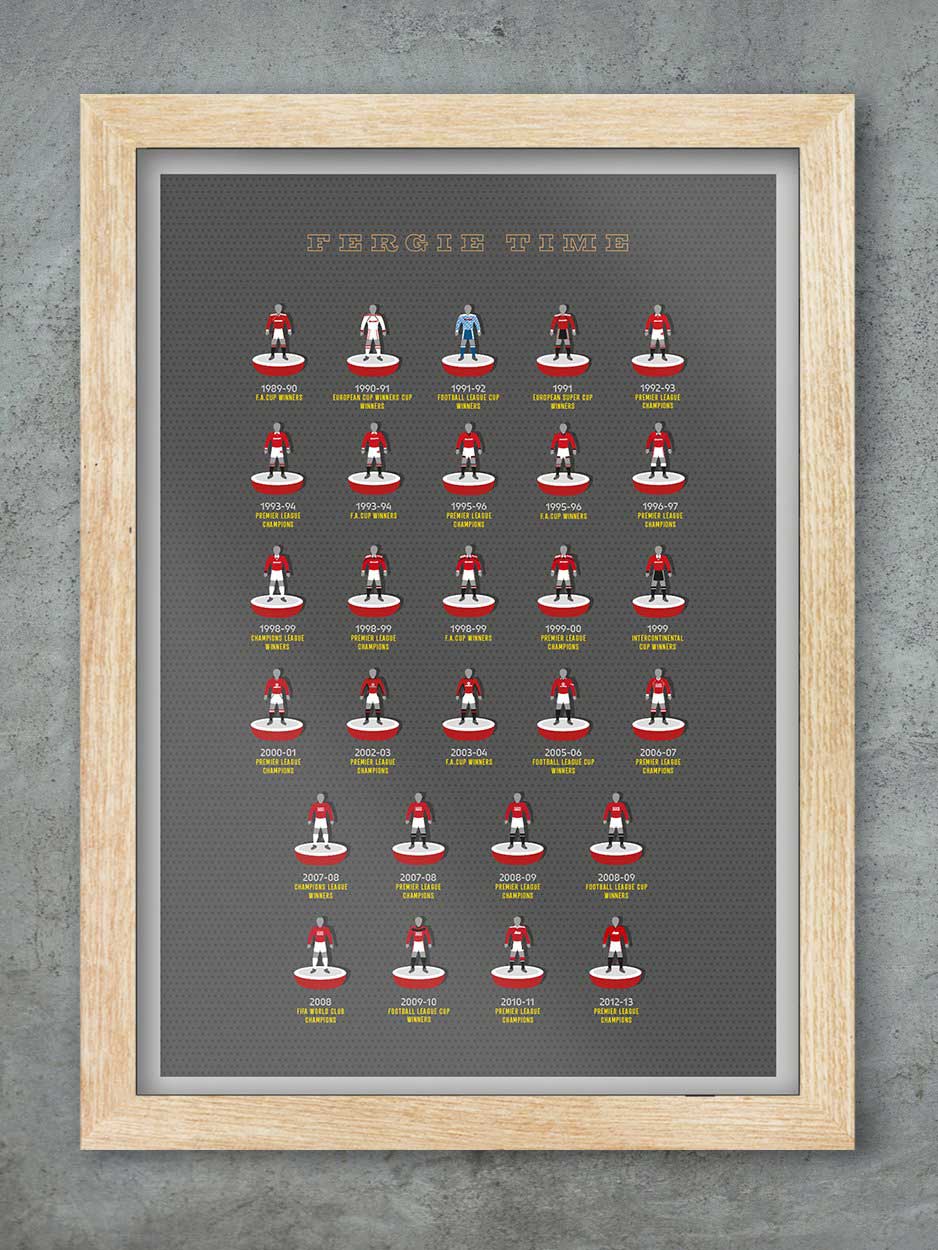 'Fergie Time' in this instance refers to the extraordinary trophy success United achieved under Sir Alex Ferguson. It charts each season's trophy years together with a Subbuteo inspired figure which shows either the season's kit or the kit worn in a particular final.