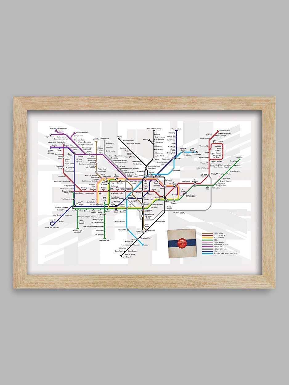 Going Underground - Music Poster Print is based on a version of the tube map where stations have been replaced with British bands. Each line represents a musical genre including Electronic, Indie, Rock etc. Where junctions are created the band featured would apply to two of more of those genres.