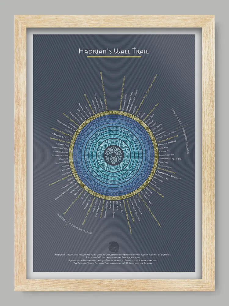 Hadrian's Wall Trail - Blue Version Poster Print is printed on a smooth 230g stock and available unframed or framed in a wooden frame with clarity+ acrylic.