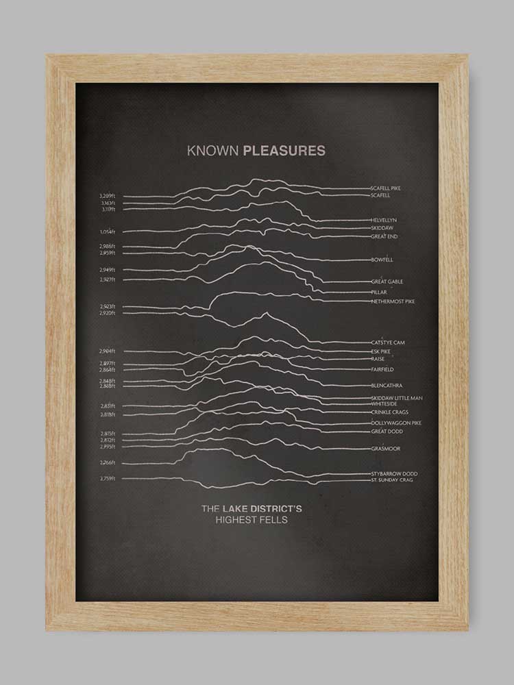 Inspired by Joy Division's Unknown Pleasures album cover, our Known Pleasures Lake District Poster Print depicts the contours of the highest Lakeland fells. It makes a perfect gift for all who love the lakes.Ā