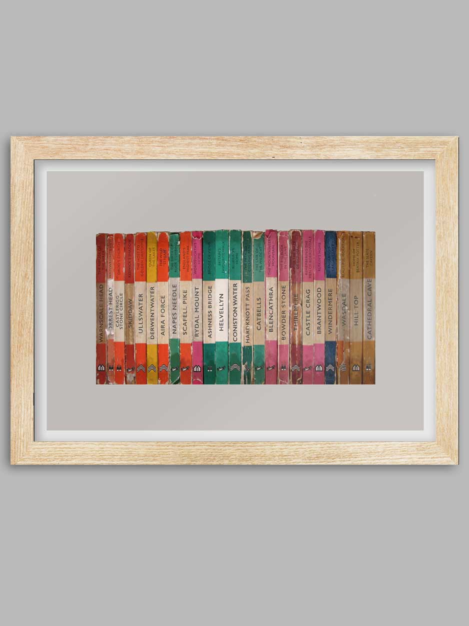 Lake District Classics Poster Print is a design based on the old mid-century Penguin book spines. It features a number of well known Lake District attractions including Helvellyn, Coniston Water, Orrest Head and with each attraction depicted with an icon at the base to reflect fells, waters, houses and attractions.