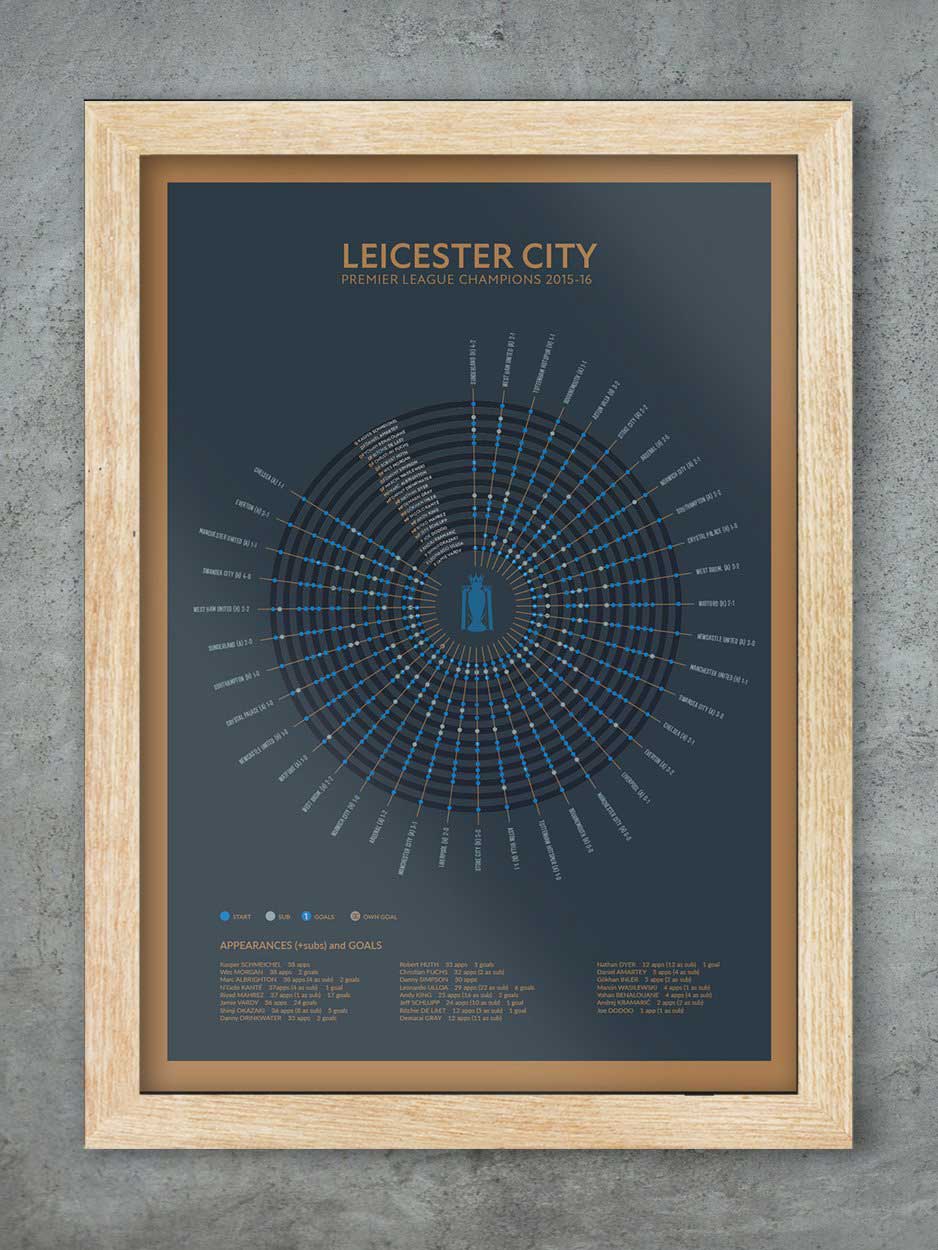 This poster records the 2015-16 season which saw Leicester claim theirĀ first ever League Title. The design covers each match, the line-ups and goalscorers.