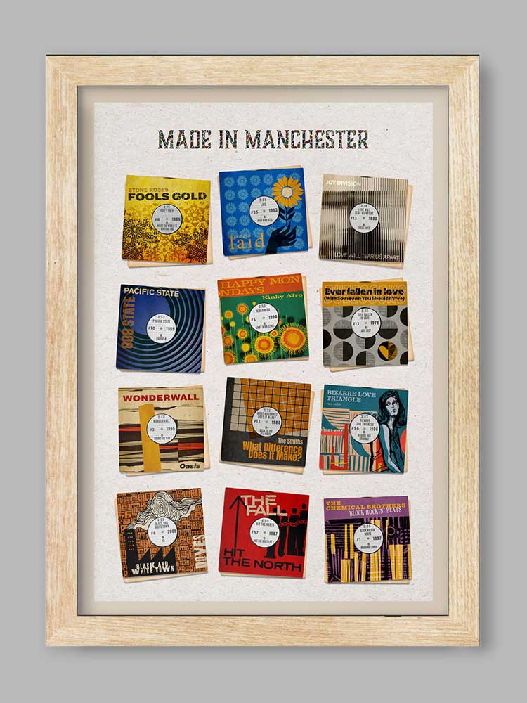 Made in Manchester Music Poster Print is printed on a smooth 230g stock and available unframed or framed in a wooden frame with clarity+ acrylic.