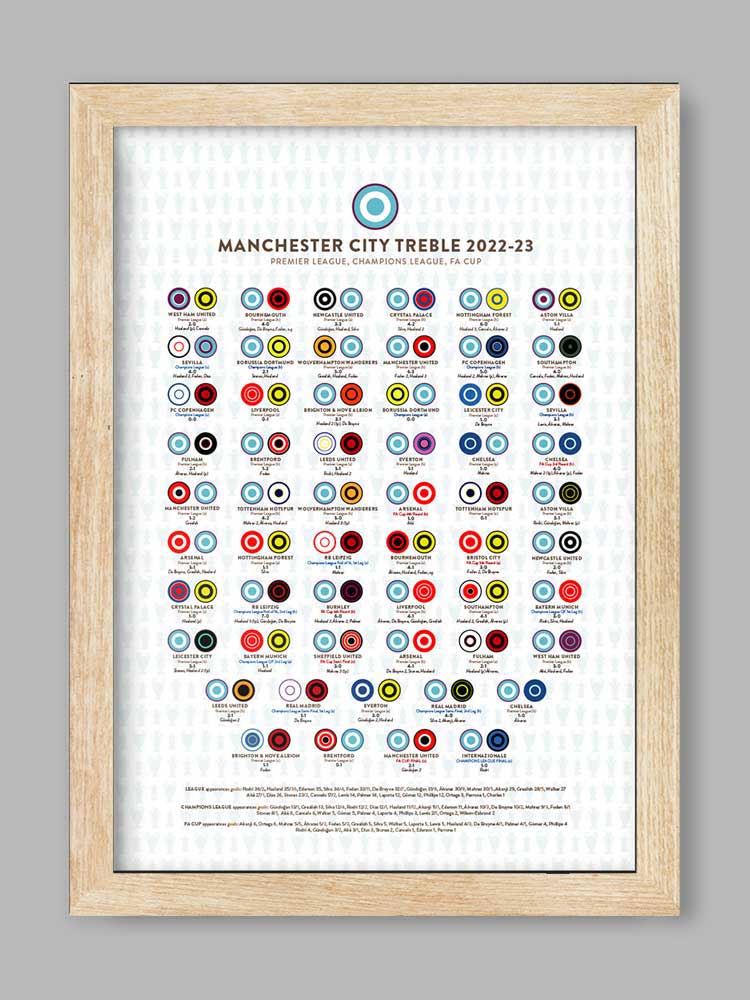 Manchester City Treble 2022-23 - Football Poster Print celebrates the club's achievement of winning the Premier league, Champions League and FA Cup in the 2022-23 season.