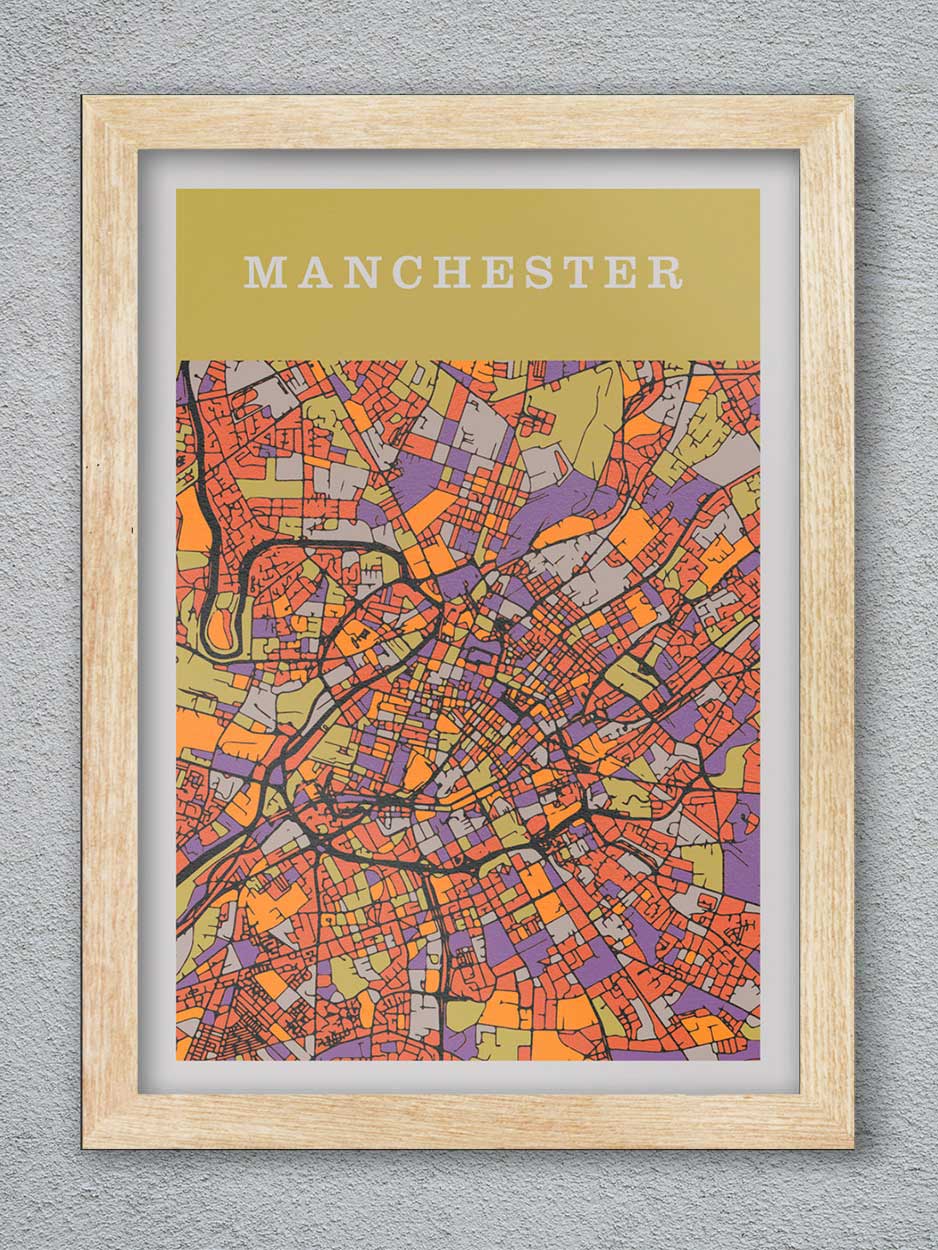 Our Manchester City Poster Print design is part map and part stained glass effect.