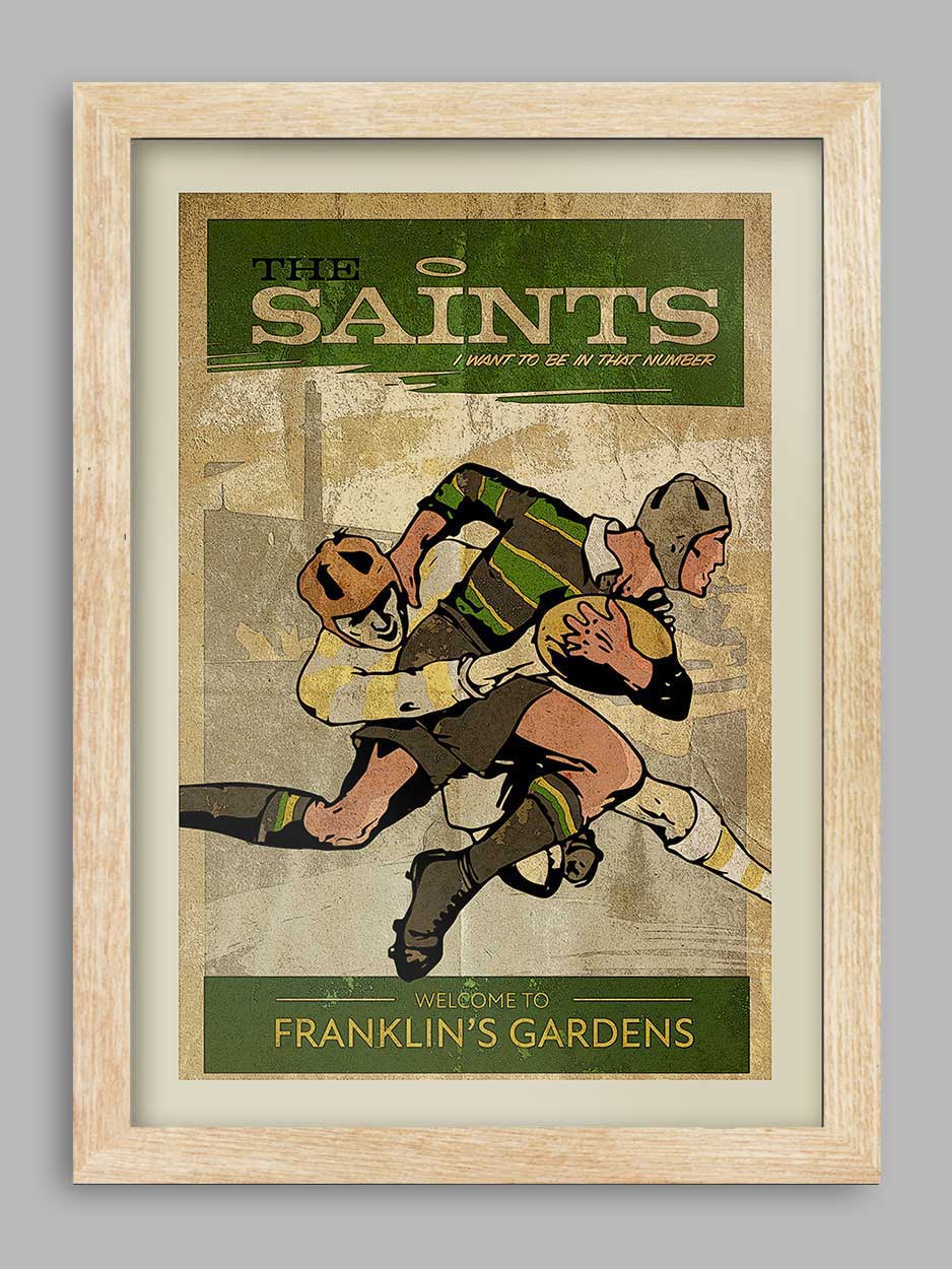 Our Retro styled Northampton Saints Poster Print is printed on a smooth 230g stock and available unframed or framed in a wooden frame with clarity+ acrylic.