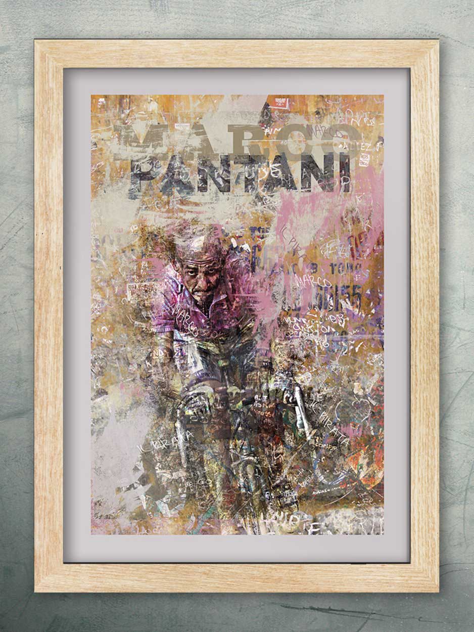 Marco Pantani Cycling Poster Print is printed on a smooth 230g stock and available unframed or framed in a wooden frame with clarity+ acrylic.