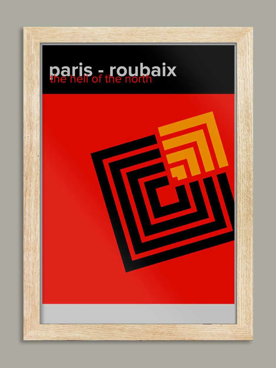 Paris-Roubaix Cycling Poster Print is printed on a smooth 230g stock and available unframed or framed in a wooden frame with clarity+ acrylic.