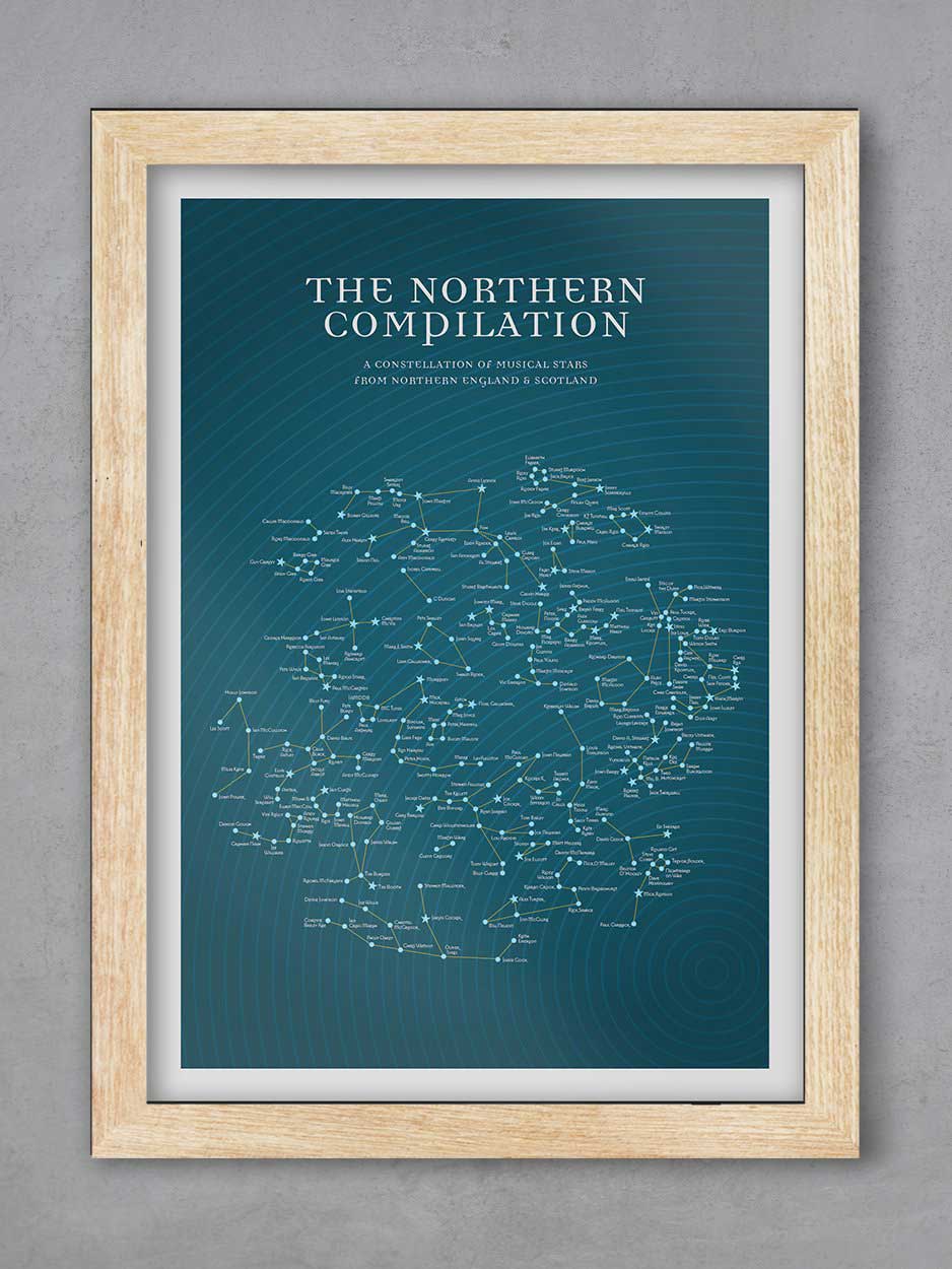Our Northern Compilation Poster Print is based on the Northern Hemisphere constellation, and features stars of music from the North and Scotland, across all musical genres. The constellation loosely, starting from Sheffield, moving through Yorkshire and the North East, Scotland and rotating anti-clockwise to feature Lancashire, Merseyside and Manchester/Greater Manchester.